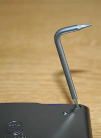 Questo è il tavolo operatorio con il paziente:Per prima cosa si devono svitare le 4 viti sul retro. Per riuscirci serve una speciale chiavetta a brugola con punta esagonale (facilmente reperibile in negozi di hobbistica)