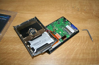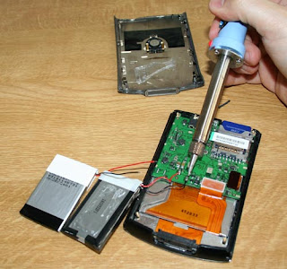 Dopo si deve aprire il palmare facendo una leggere pressione sui lati con la punta di un piccolo cacciavite a testa piatta. La batteria è incollata sul retro della custodia e saldata sulla scheda principale.